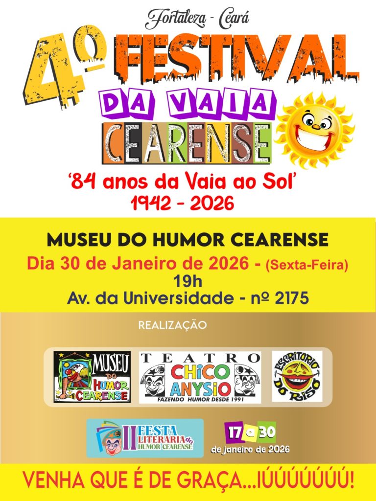 O Museu do Humor Cearense realiza neste 30 de janeiro de 2026, o 4° Festival da Vaia. Eita, piula! Só podia ser coisa de cearense esta brincadeira de tornar a vaia algo tão peculiar, orgânico, irreverente etc coisa e tal!